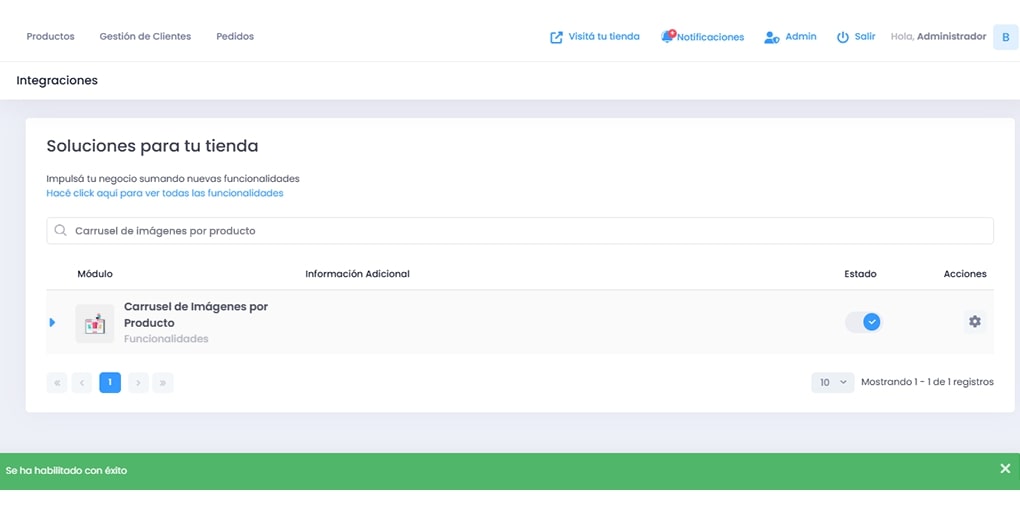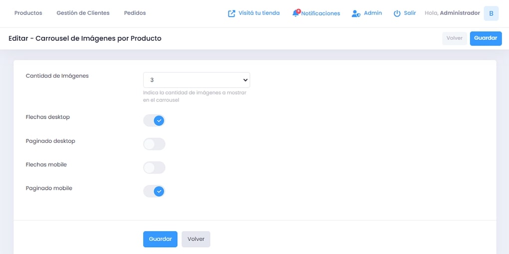 Esta funcionalidad permite que cada producto en tu tienda muestre varias imágenes en un formato carrusel, brindando a los clientes una vista más completa y detallada de los artículos. Es ideal para destacar características únicas, diferentes ángulos o usos del producto.