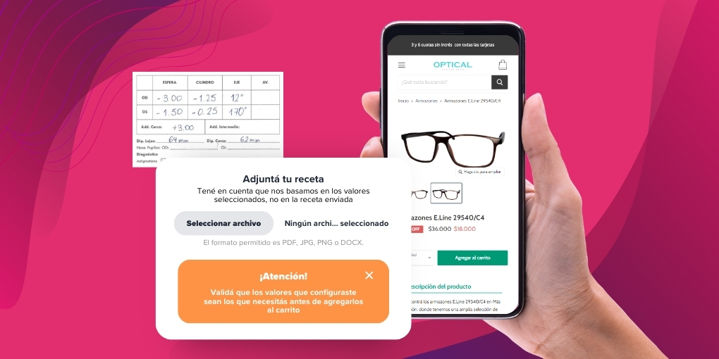 EyePlus facilita la venta de productos con receta, permitiendo que los clientes carguen su prescripción o elijan el tipo de lente directamente desde tu tienda. A diferencia de un checkout genérico, ofrece una experiencia de compra pensada para el rubro óptico: clara, profesional y segura, lo que mejora la conversión y genera confianza.