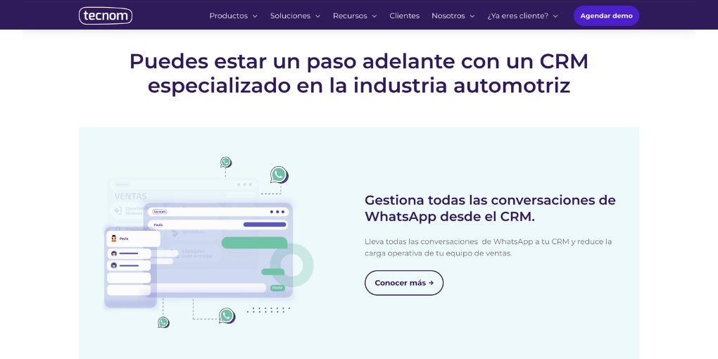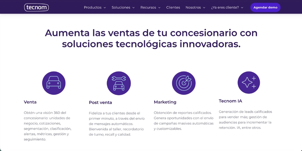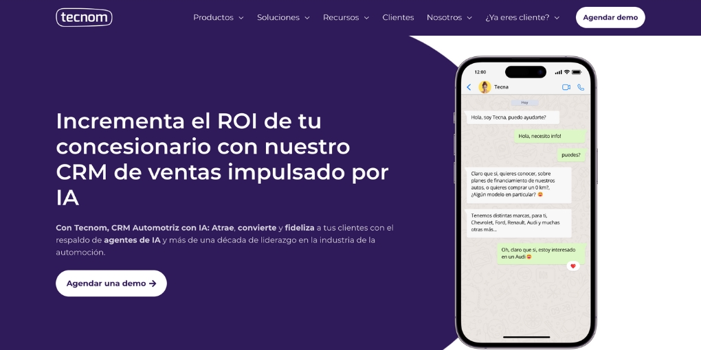 Tecnom es un CRM diseñado especialmente para la industria automotriz, que unifica ventas, postventa y marketing con el respaldo de inteligencia artificial. Permite centralizar leads provenientes de WhatsApp, redes sociales, formularios y otros canales en un único panel, automatizar la calificación de clientes, gestionar cotizaciones, coordinar turnos de taller y realizar seguimiento comercial con una visión 360° de cada contacto.