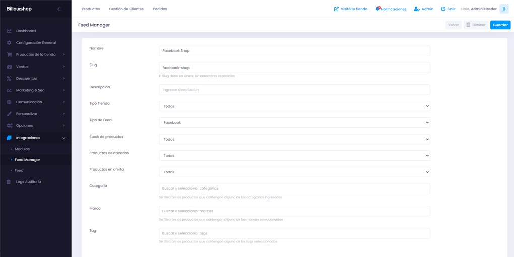 - Gestión Centralizada: Olvídate de la complejidad al gestionar múltiples feeds de productos. Feed Manager te permite centralizar el control y la optimización de tus feeds, simplificando todo el proceso desde un solo lugar en tu panel de administrador Billowshop.