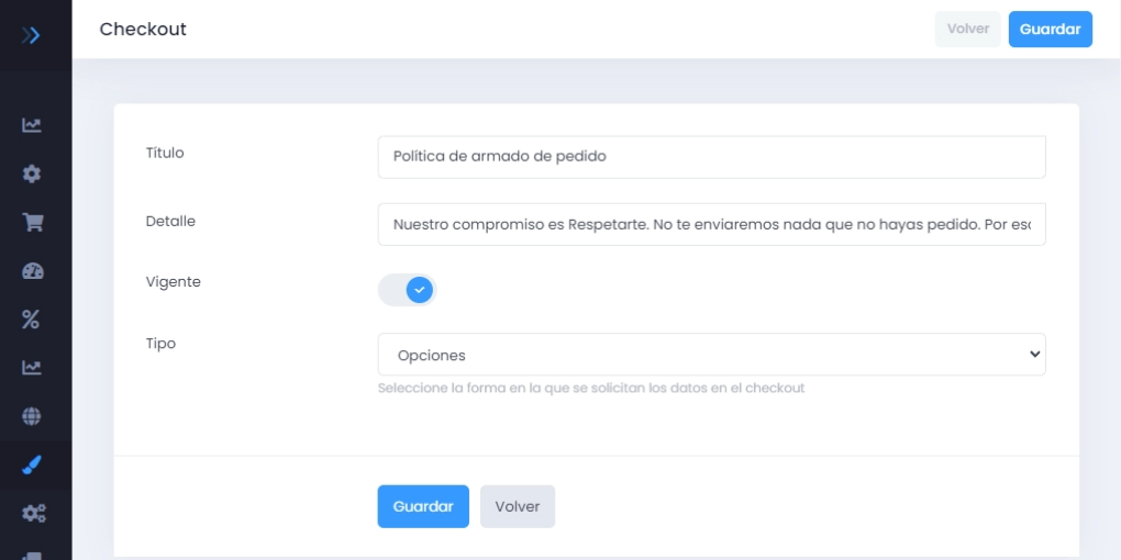 El módulo de checkout Avanzado se encarga de mostrarle al cliente la información de compra que incluyas como obligatorio para realizar la operación